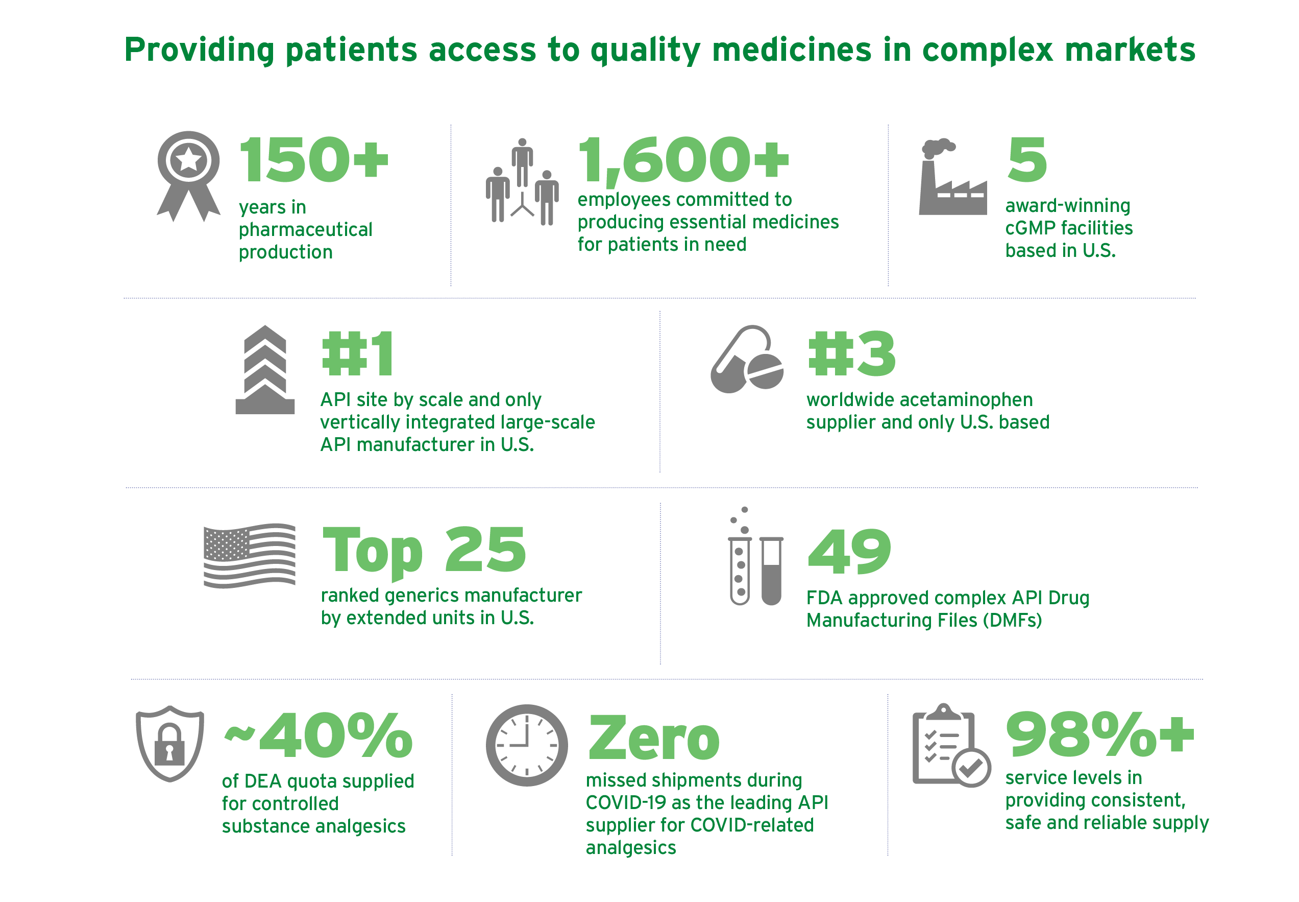 As a manufacturing leader in the US generics industry, we are focused on meeting patient’s needs today and advancing our growing portfolio of complex generic pharmaceuticals and active pharmaceutical ingredients to help treat a greater set of patient needs in the future.
