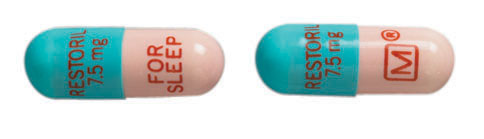 Imprinted "FOR SLEEP" on one side, other side boxed "M"® in red. Blue cap imprinted "RESTORIL 7.5 mg" twice in red |
